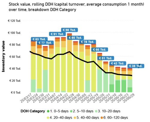 Im Ergebnis wurde für den ersten Pilotlieferanten der Bestand innerhalb von 5 Monatenum mehr als 52% reduziert. Parallel sank die Reichweite um 36% von 28 auf 18 Tage. Somit konnte alleine für den ersten Pilot-Lieferanten die Kapitalbindung um 31.000 EUR reduziert werden, durch Übertragung auf weitere Lieferanten ergibt sich ein wichtiger Effekt im laufenden Geschäftsjahr. Bei den 2 weiteren Lieferanten der Pilotphase lag der Effekt im Bereich der Bestandsreduzierung bei 32% beziehungsweise 48%.