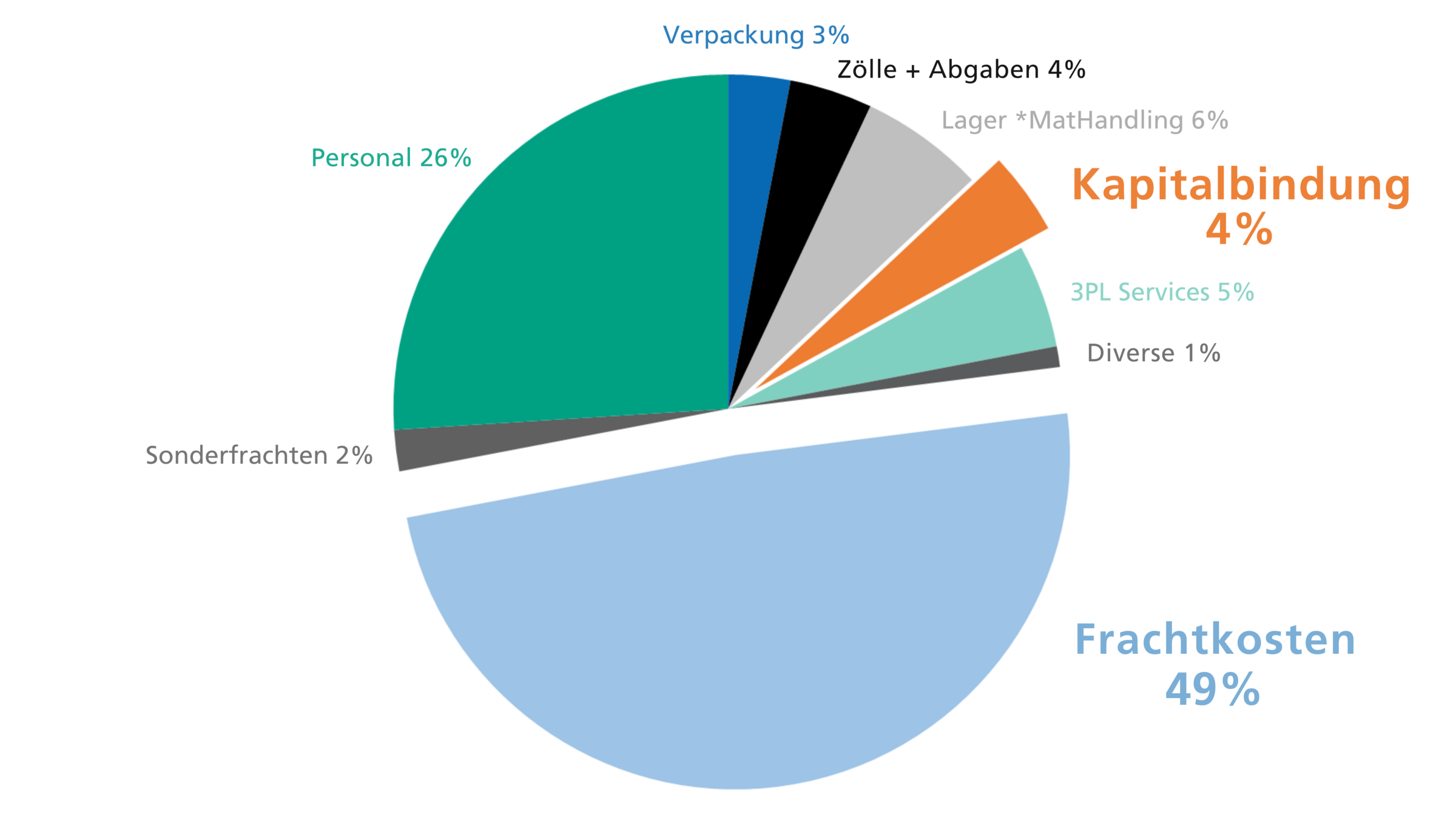 Die Logistikkosten eines Unternehmens ergeben sich aus der Aufsummierung von verschiedenen Logistikkostenarten, deren typische Aufteilung auf Basis unserer  Erfahrung aus über 100 Projekten in der Grafik dargestellt sind.  Den größten Anteil an den Logistikkosten macht dabei die Logistikkostenart Fracht-/Transportkosten aus, welche sich zusätzlich nochmal in verschiedene Bestandteile, wie z.B. der reinen Frachtrate bzw. dem Frachttarif und Zusatzkosten wie Treibstoffzuschlägen unterteilt. Diese (und weitere) Parameter sind wichtig, um ein detailliertes Bild der aktuellen Kosten in der gesamten logistischen Kette zu bekommen und mögliche Handlungsfelder für tiefergehende Analysen zu identifizieren.